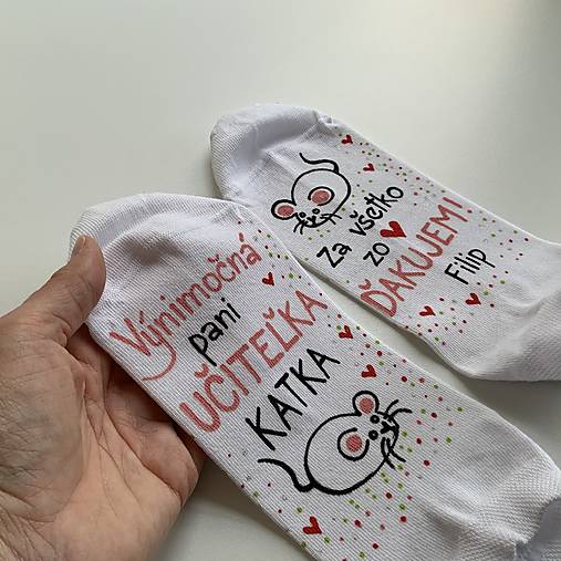 Maľované pestrofarebné ponožky pre Výnimočnú PANI UČITEĽKU a nápisom “Za všetko zo ❤️ ĎAKUJEME (meno)”biele s ovečkou