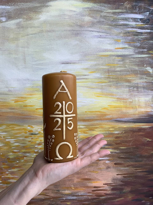 Ručne maľovaná veľkonočná svieca vhodná na domáce slávenie Veľkonočných obradov. Doma si môžete takto zhmotniť tajomstvo Veľkej Noci, že Kristus je svetlo sveta. Môžete ju potom používať celý rok pri domácej liturgii, pri modlitbe a podobne.