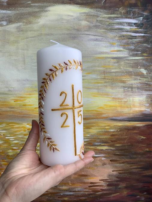 Ručne maľovaná veľkonočná svieca vhodná na domáce slávenie Veľkonočných obradov. Doma si môžete aspoň takto zhmotniť tajomstvo Veľkej Noci, že Kristus je svetlo sveta. Môžete ju potom používať celý rok pri domácej liturgii, pri modlitbe a podobne. Rok upravím na 2025!