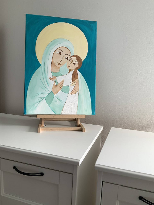Visí u nás už pár rokov, rada sa naňho pozerám, pri jej maľbe mi v ušiach zneli tieto slová piesne z môjho detstva: "Čakajú Ťa nástrahy tohoto sveta, Mária Ťa volá, poď moje dieťa! Mária ma ochraňuje ja sa nebojím, vrhnem sa pod jej ochranný plášť!"